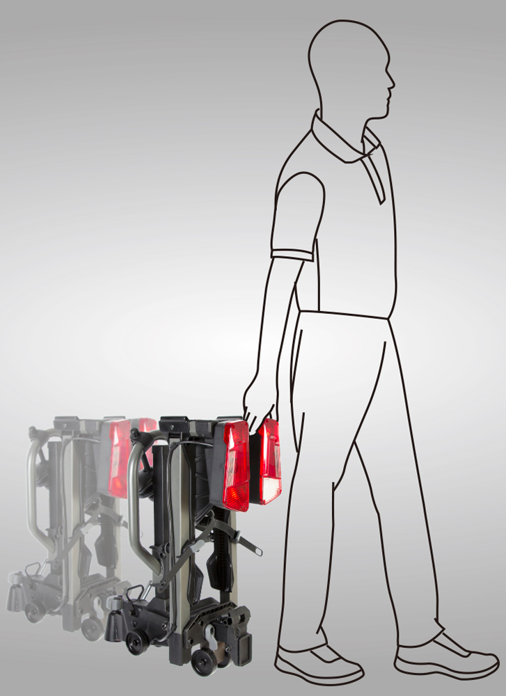 - Durch intergrierte Transporträder kann der Fahrradträger zum Auto gerollt werden