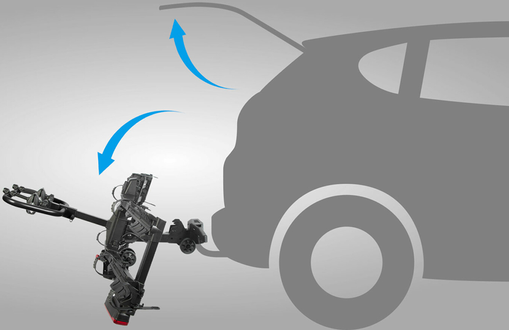 Ein sanfter Kippmechanismus ermöglicht das Absenken der Plattform, selbst bei voller Beladung – entweder über den Hebel hinter dem Nummernschild oder durch leichtes Drücken des unteren Bereichs
