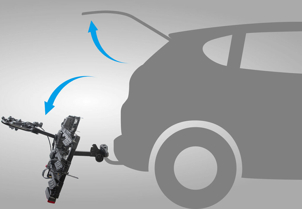 Ein sanfter Kippmechanismus ermöglicht das Absenken der Plattform, selbst bei voller Beladung – entweder über den Hebel hinter dem Nummernschild oder durch leichtes Drücken des unteren Bereichs